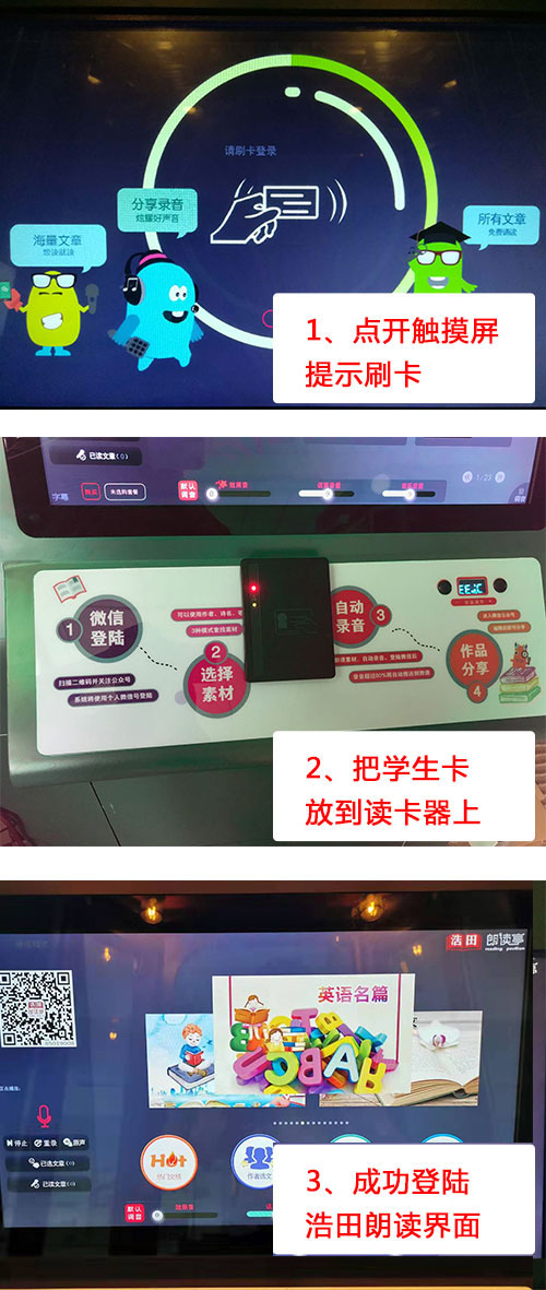 朗讀亭在中小學校園一般是不能攜帶手機上學的,學校想買一臺朗讀亭,還要考慮到怎么登陸朗讀界面的問題。廣州浩田數碼科技有限公司研發的——校園無手機朗讀方案。
