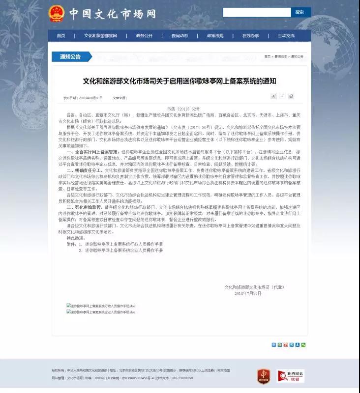 與此同時,也出現(xiàn)了設(shè)備安全難保障、衛(wèi)生環(huán)境較差、歌曲內(nèi)容違規(guī)或者侵權(quán)等問題,針對這些問題,2017年,文化和旅游部發(fā)布了《文化部關(guān)于引導(dǎo)迷你歌詠亭市場健康發(fā)展的通知》,全面規(guī)范了迷你歌詠亭市場,近日,文化和旅游部文化市場司印發(fā)了《關(guān)于啟用迷你歌詠亭網(wǎng)上備案系統(tǒng)的通知》,通知要求各相關(guān)部門全面實(shí)行網(wǎng)上備案管理,并明確了權(quán)責(zé)分工,規(guī)范了迷你歌詠亭的日常管理和監(jiān)督檢查工作。此消息一出,一石激起千層浪。