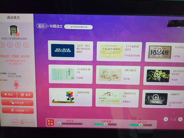 校園“朗讀亭”,以朗讀體驗(yàn)方式為主,集朗讀練習(xí)、錄制、演講訓(xùn)練、閱讀為一體,并可通過(guò)微信分享自己朗讀的內(nèi)容。“朗讀亭”使用高強(qiáng)度全隔音鋼化玻璃,保證安全的同時(shí)阻隔95%的聲音,朗讀者關(guān)門(mén)后可靜享屬于自己的私密空間。朗讀亭專業(yè)定制的“朗讀亭”具有專業(yè)的錄音棚設(shè)備,頭戴式耳機(jī)和專業(yè)麥克風(fēng),可以滿足高保真音響、低噪音環(huán)境訴求,讓朗讀者在聽(tīng)和朗讀的過(guò)程都輕松自然。而且,每個(gè)用戶用自己的微信賬號(hào)即可登陸,自動(dòng)錄音和及時(shí)分享。
